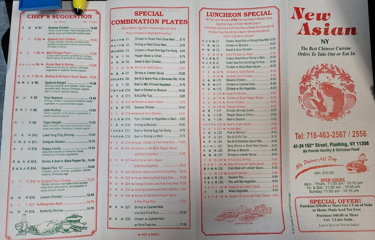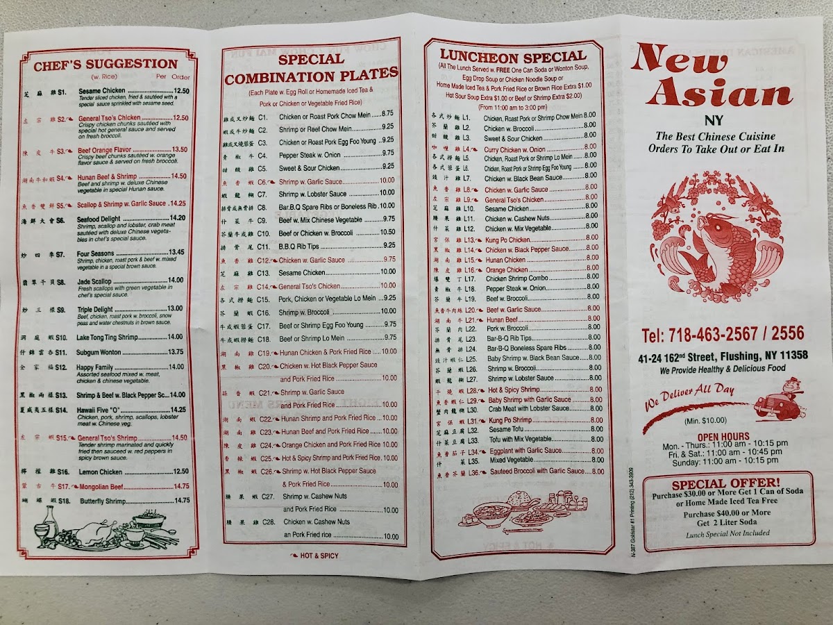 From a reviewer’s perspective, the menu at New Asian NY, located at 41‑24 162nd St in Flushing, feels like a mix of classic Chinese takeout staples served at surprisingly low prices, giving diners plenty to explore without spending much. Highlights include the slippery noodles of Beef Chow Fun | $5.75, the spiced strands of Singapore Chow Mei Fun | $6.25, and the seafood‑packed Seafood Delight | $12.00, each showcasing different noodle and protein combinations with a satisfying portion size. For those craving familiar Chinese‑American favorites, the sweet‑savory kick of General Tso’s Chicken | $0.50 offers a surprising bargain, while the crisp texture of Fried Fish W. F. R. | $6.50 adds variety to the lineup. These dishes, named boldly on the menu with their accessible prices, paint a picture of a menu that’s casual, diverse, and focused on delivering hearty, affordable meals that appeal to both local regulars and newcomers alike.